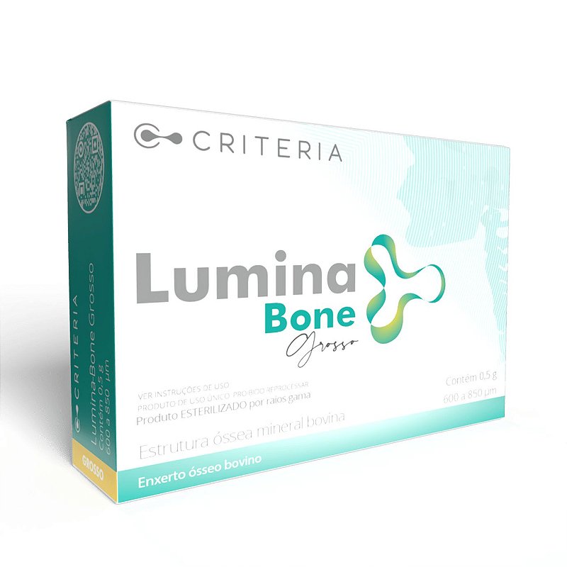LUMINA- BONE é um produto obtido da matéria-prima natural da estrutura óssea de bovinos, comprovadamente controlados e rastreados desde o nascimento até o abate, atendendo as exigências do Ministério da Agricultura. Como composto mineral do cálcio e fósforo e acelular, LUMINA-BONE possui extrema semelhança com o tecido ósseo mineral do corpo humano, sendo plenamente biocompatível. Atua como um estimulador para neoformação óssea. De acordo com características deste biomaterial, como produção a partir de osso cortical e tamanho de grânulos, LUMINA-BONE é absorvido pelo organismo em um prazo relativamente mais lento, indicado para procedimentos cirúrgicos de preenchimento e manutenção de volume. Com capacidade hidrofílica, LUMINA-BONE proporciona facilidade de manuseio ao ser misturado com o sangue do paciente e/ou soro fisiológico antes da aplicação, Seu pH corresponde a níveis fisiológicos citados em literatura, o que é muito importante durante as fases iniciais da implantação. É um produto direcionado a todas as técnicas de preenchimento, sendo um excelente recurso para preservação de alvéolos pós exodontia e preenchimento de gap entre o implante e a parede vestibular de modo seguro, simples e econômico.